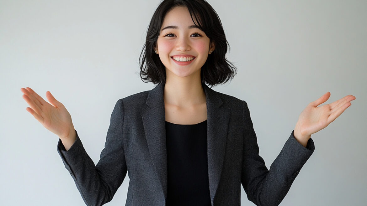 女性 じょせい 女子 じょし 女 おんな 人物 じんぶつ 仕事 しごと 会社員 かいしゃいん 派遣 はけん 転職 てんしょく 働く はたらく スーツ ビジネス 事務員 じむいん OL ハンドサイン 笑顔 えがお 両手を広げる りょうてをひろげる 若い わかい スーツ